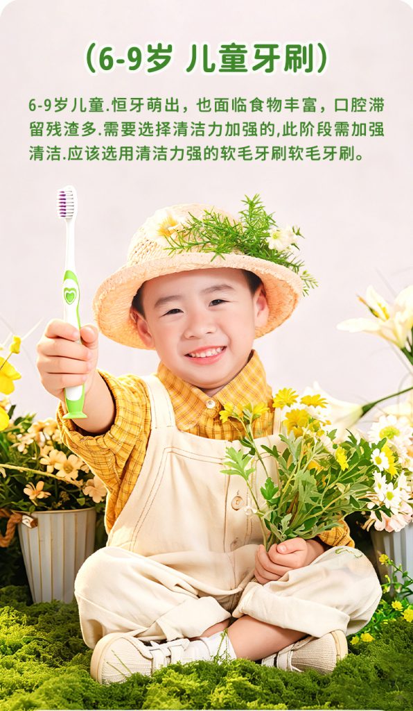 1、抗菌護齦:0.12mm 超纖細柔抗菌軟毛 + 高磨圓工藝,雙重呵護,溫和清潔換牙期牙齦,適配兒童口腔使用。