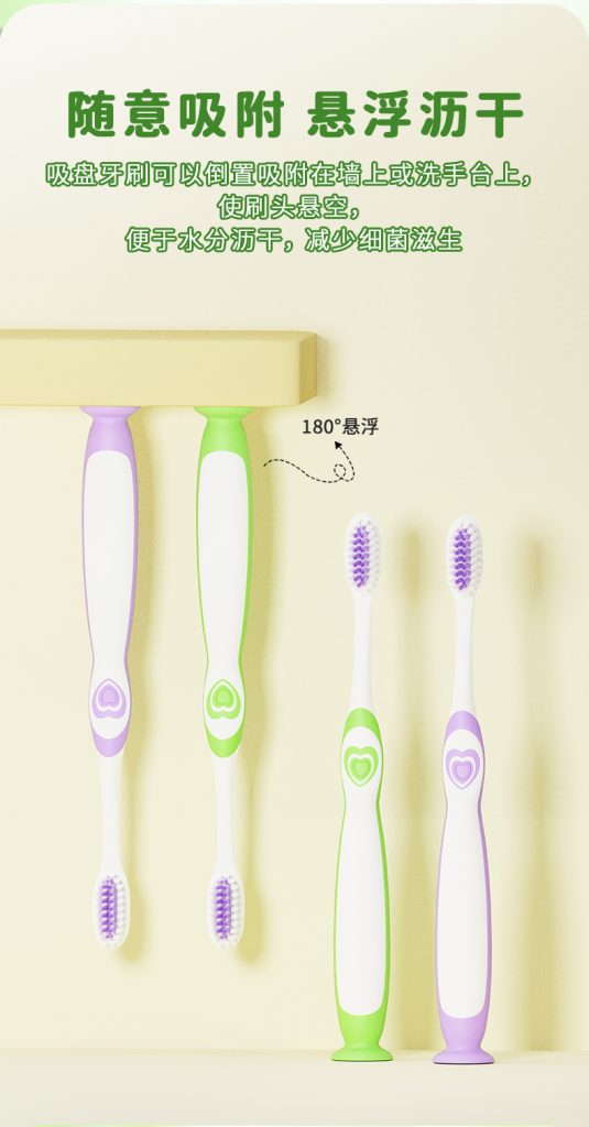 4、便捷收納:吸盤式站立設計,可倒置吸附瀝水,刷頭懸空干爽,方便收納,培養孩子刷牙好習慣。