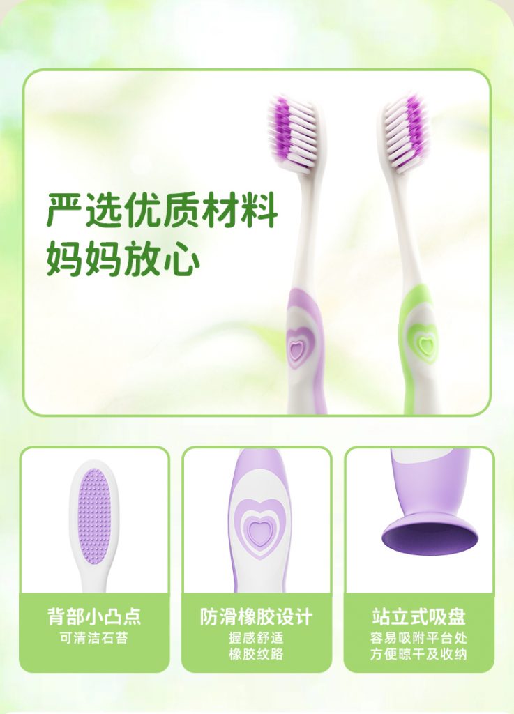 產品材質:PP(刷柄主體)、TPE(軟膠包裹)、PBT(抗菌軟刷毛)(食品級安全材質,適配兒童使用)