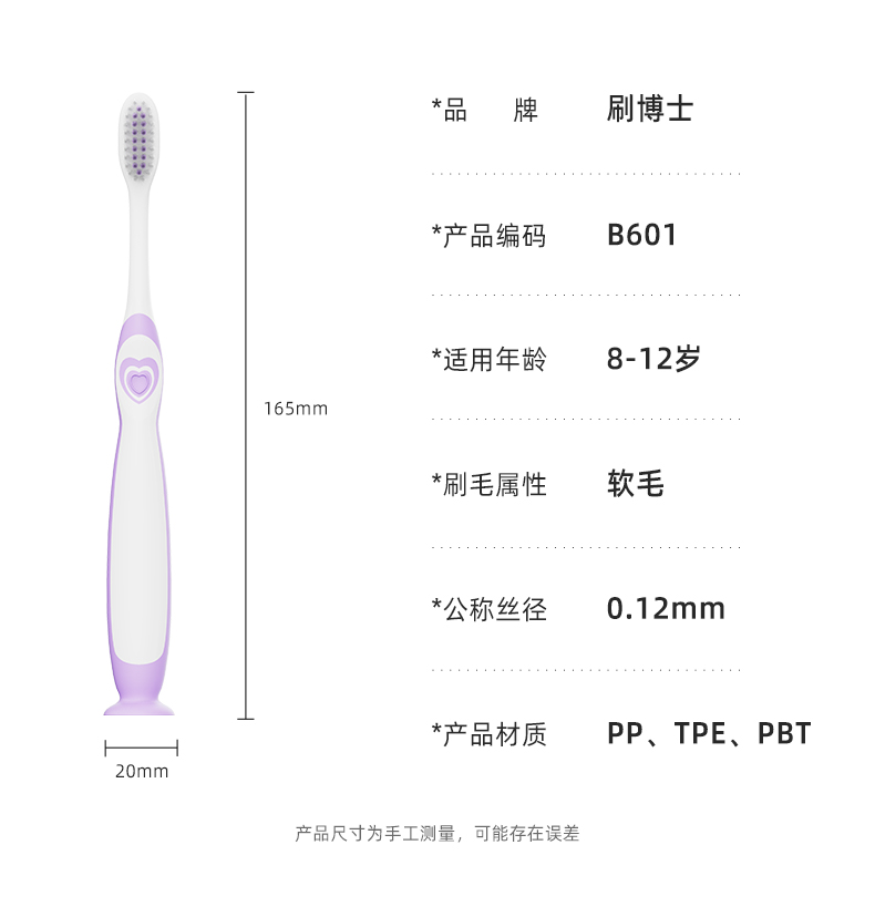 刷博士 B601 兒童可站立牙刷,采用抗菌軟毛 + 超纖細柔刷絲雙效設計,高效清潔同時溫和護齦;99.9% 抗菌率認證 + 食品級軟包膠,守護成長更安心;間隔分布透氣刷面 + 吸盤式站立設計,適配兒童口腔精準呵護;8-12 歲專屬款型,全方位守護孩子口腔健康。